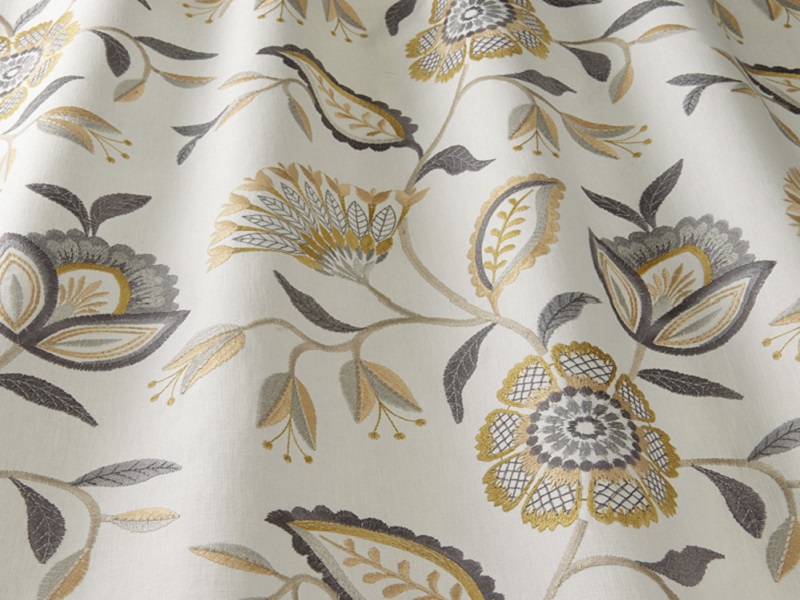 From the Pembury Collection - Ophelia has a polyester and cotton basecloth giving a matt finish with a lustrous viscose embroidery. It is graded as a heavy weight fabric at 380gms per sq metre and suitable for curtains and accessories.